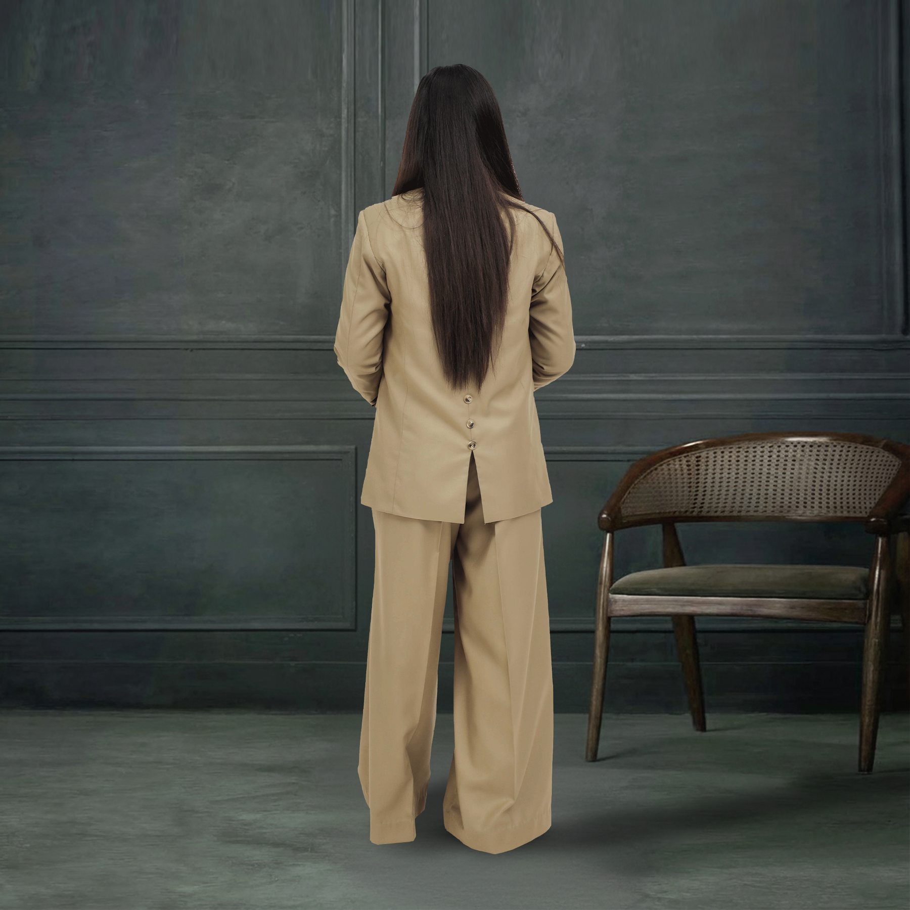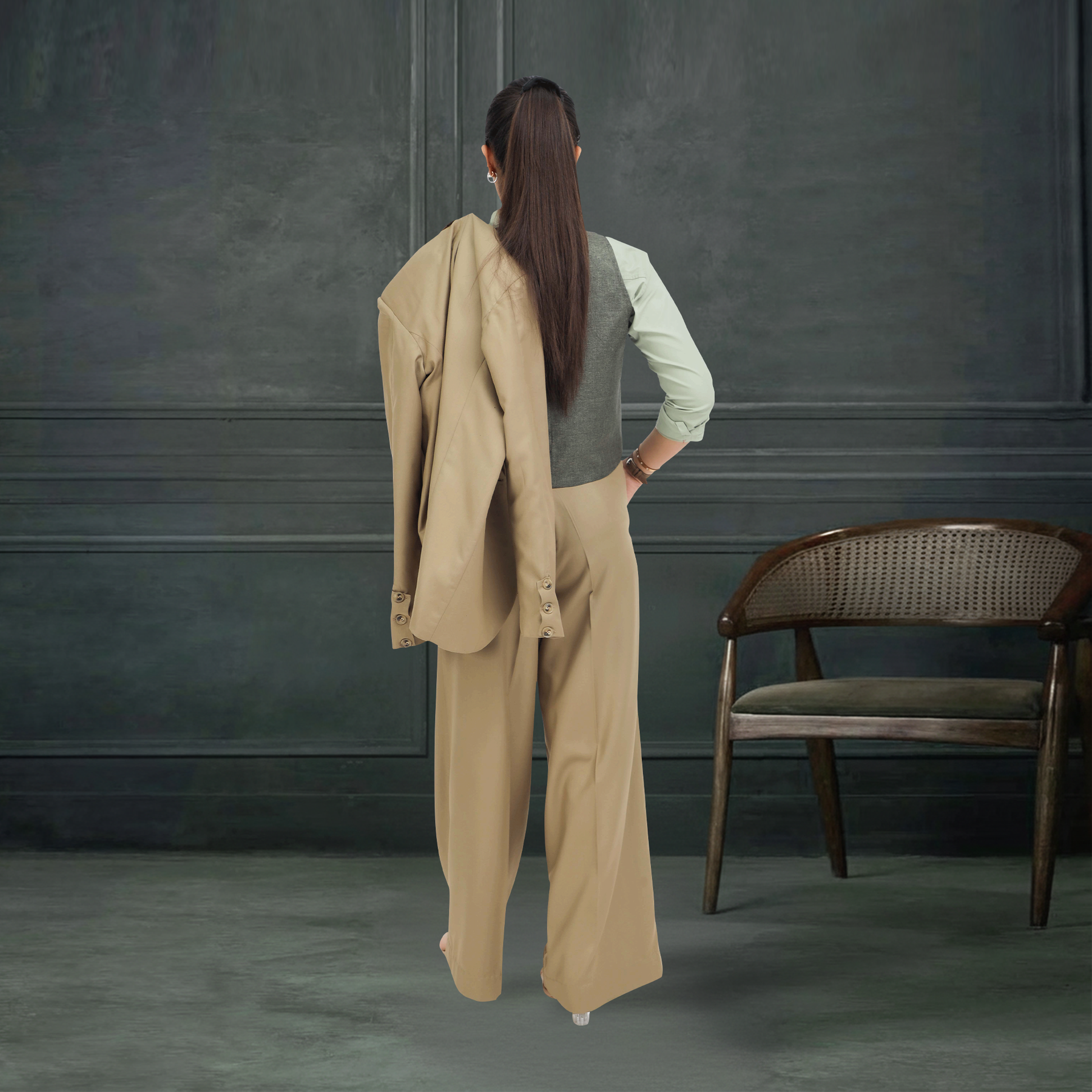 The set features a structured beige blazer, a contrasting textured olive green waistcoat, and trending wide-leg trousers. Whether you are heading to a boardroom meeting or a formal event, this tailored look commands attention while ensuring you stay comfortable.
