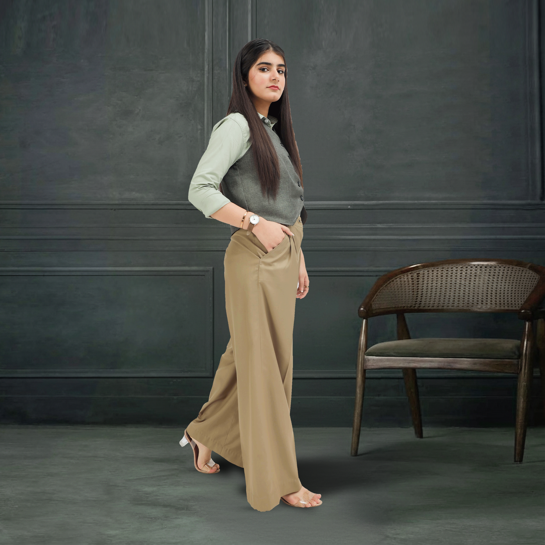 • The Layering: Includes a smart olive grey button-down waistcoat for added versatility.