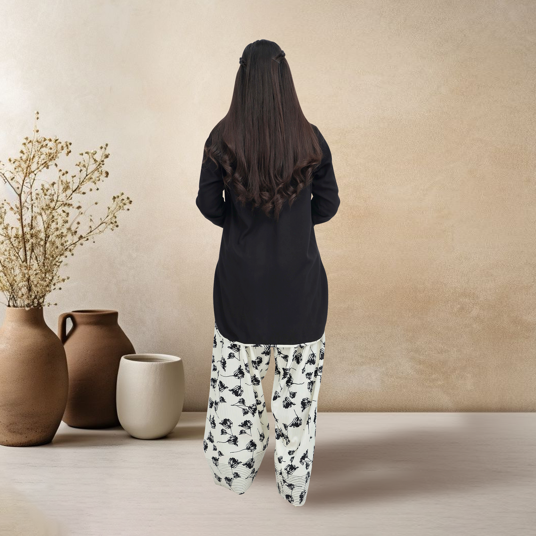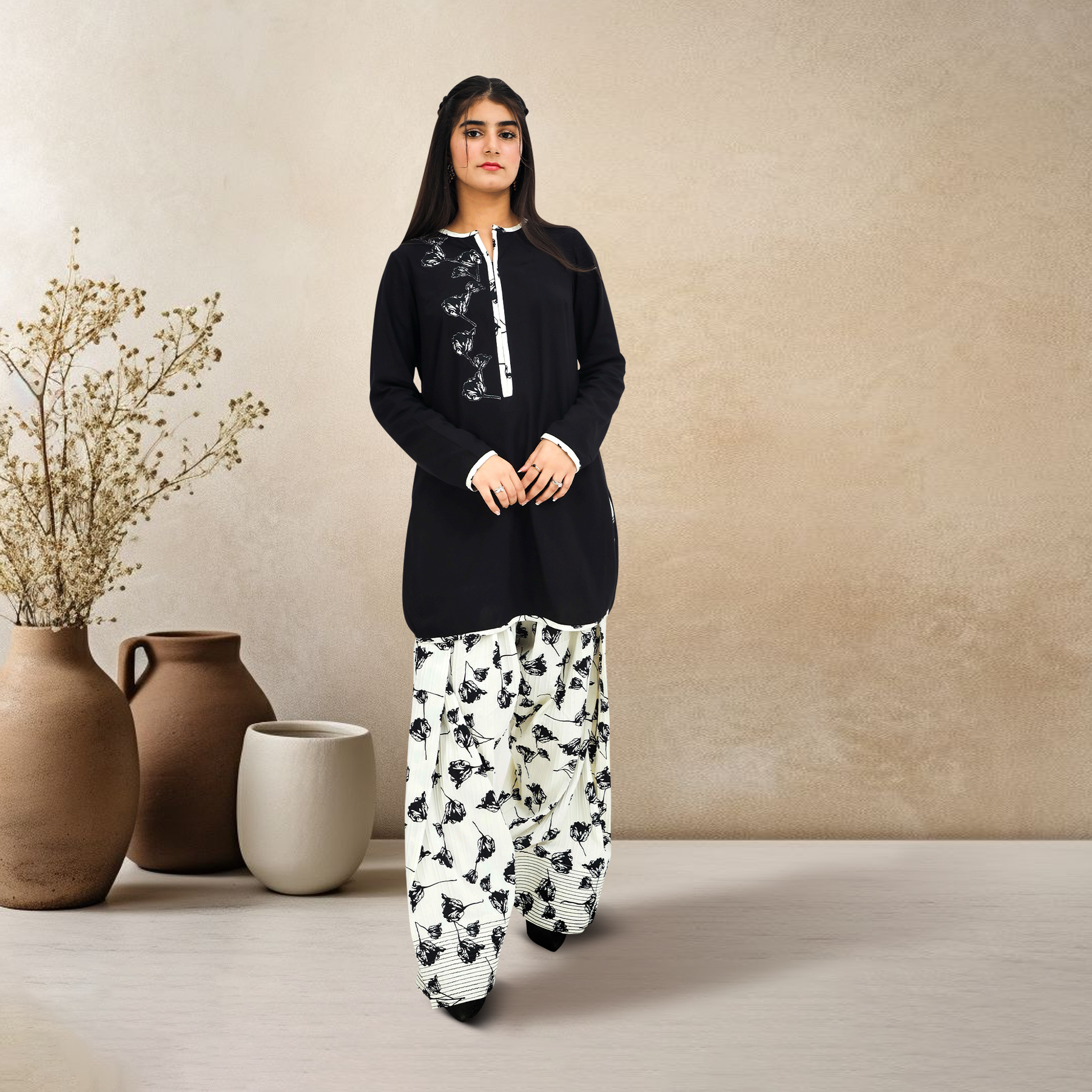 Make a chic statement with this monochrome Black & White Embroidered 2-Piece Suit. The solid black kurta features an artistic white floral embroidery motif cascading from the shoulder down the placket, creating a modern, asymmetrical look.